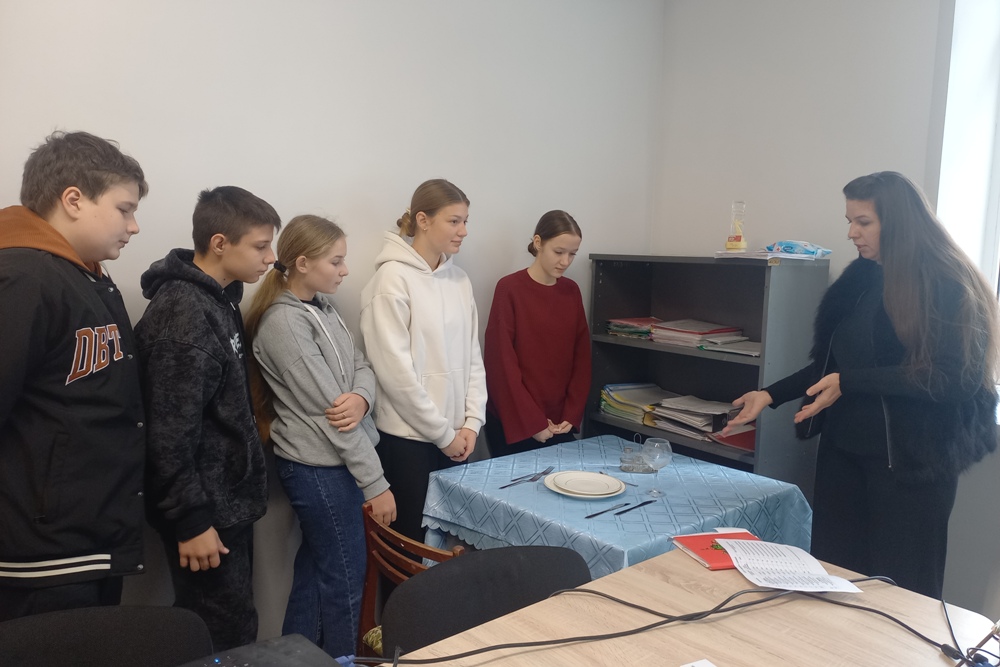Преподаватель Анна Александровна Шилина начала занятие с инструктажа по технике безопасности, а затем рассказала о качествах, необходимых для успешной работы официантом. Чтобы создать дружелюбную атмосферу и сплотить ребят, она использовала загадки, конкурсы и игры.